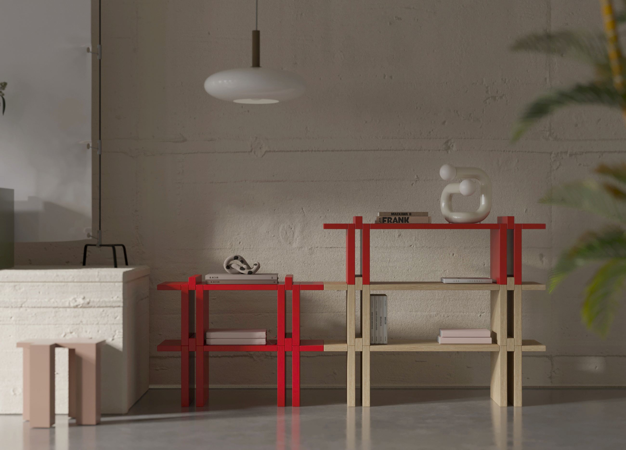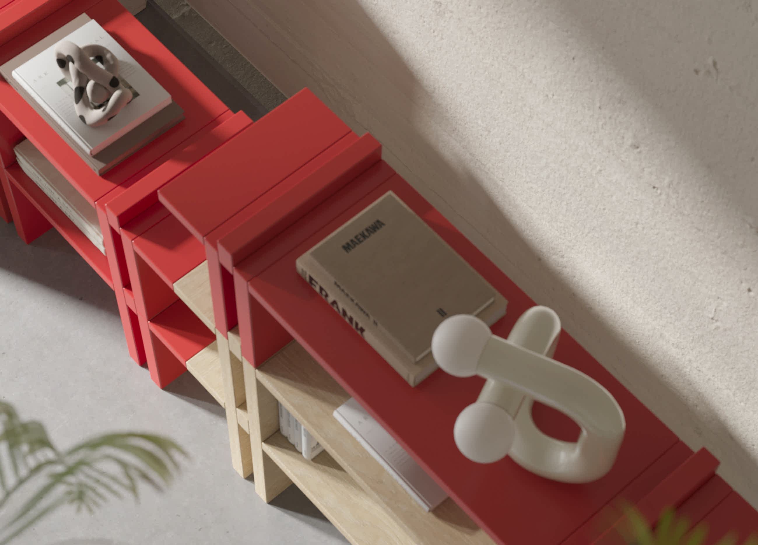 Sağda yer alan Pin raf sistemi, geleneksel Japon esintilerini modern bir bakış açısıyla yeniden yorumluyor. Kırmızı detaylarıyla enerji Pinco açık ahşap dokularıyla denge kurarak mekânda sofistike bir kontrast yaratıyor.