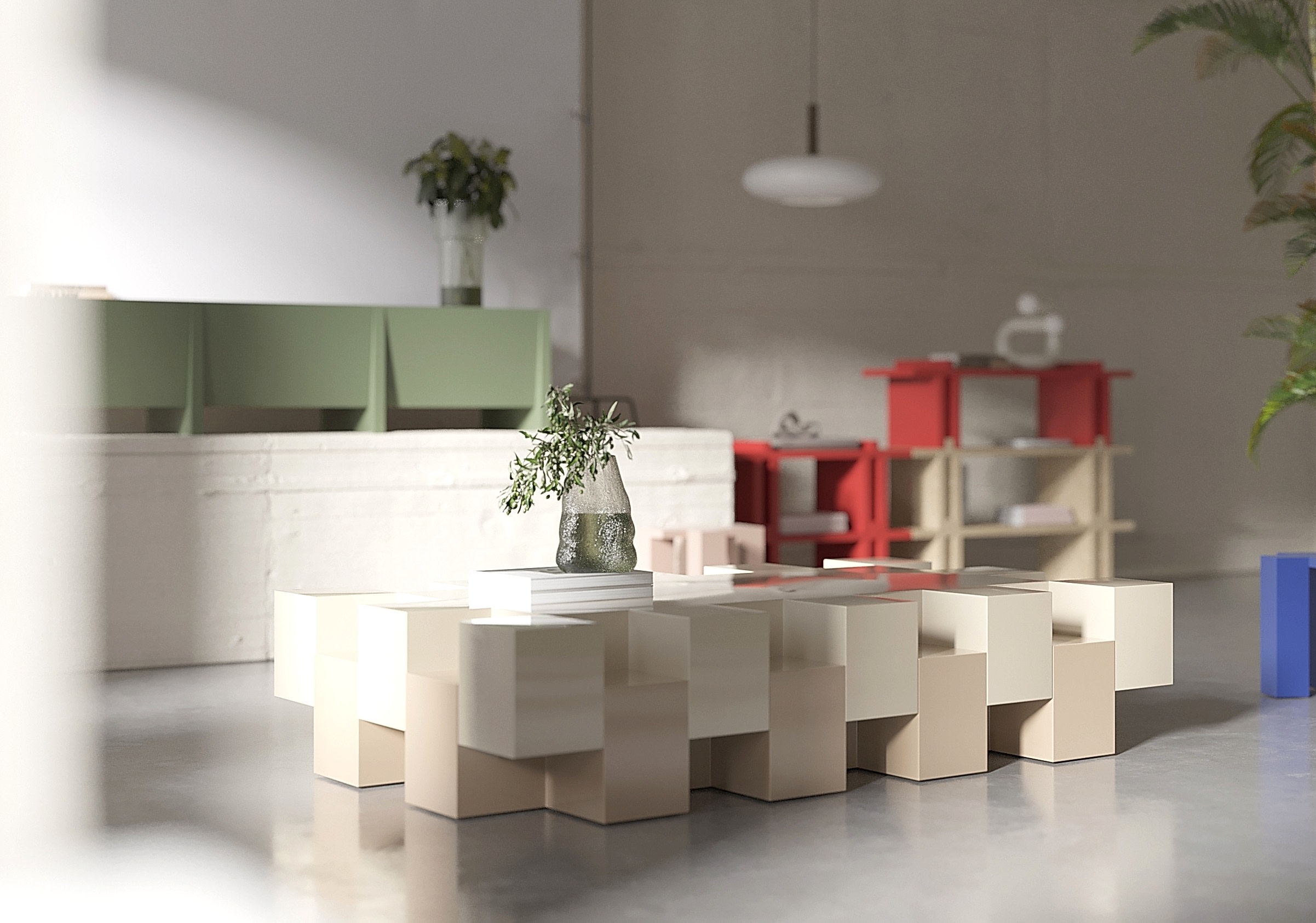 Ön planda yer alan Pinco Sehpa, kubik yapısıyla ışık ve gölge oyunlarına alan tanıyor. Parçalı tasarımı sayesinde hem işlevsel hem de estetik bir obje olarak öne çıkıyor.